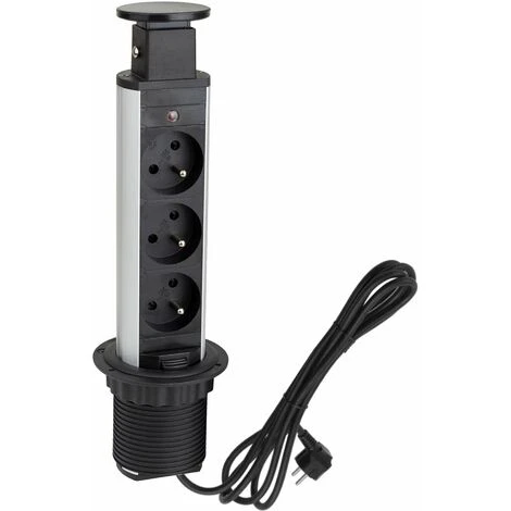 Bloc multiprise encastrable ; Bloc de 3 prises de courant 230V ; Type de prise = Française ; Diamètre de perçage = 60mm ; Longueur du câble de branchement = 2 mètres ; Couleur = Gris / Noir ; Discret et efficace, il suffit juste d’appuyer sur le socle et de tirer ;