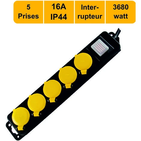 Bloc multiprises 5 prises 16A + inter 2P+T IP44 3G1.5mm²