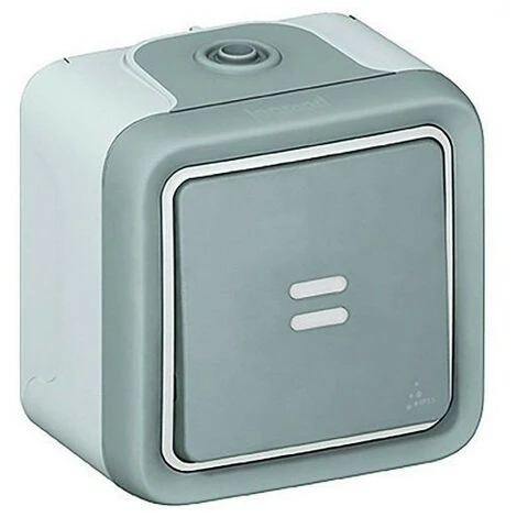 Bouton poussoir lumineux en surface MBLOC PLEXO. Boutons poussoirs 10 A – IP 55 – IK 07 – Connexion borne automatique – Bouton poussoir NO lumineux – Avec lampe 230 V – Gris. Plexo – Mécanismes étanches IP 55 – monobloc – en saillie – interrupteurs, boutons poussoirs et interrupteurs automatiques – Livré complet avec 2 cônes – plaque sans raccord.