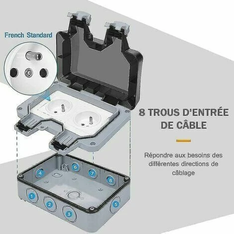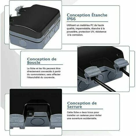 Conception étanche IP66 : utilisation d’un matériau PC de haute qualité, anti-UV, anti-corrosion. IP66 protégé contre les intempéries et la poussière, offre un haut niveau de protection contre la pénétration d’eau et de poussière. Sûr et pratique à utiliser : cette prise a deux trous pour attacher un cadenas afin d’éviter une ouverture accidentelle. Il peut être ouvert à tout moment lorsqu’il a besoin d’électricité. Conception conviviale de la boucle de commutation: la fiche et le câble peuvent être connectés directement à partir de l’interrupteur sans affecter l’étanchéité du couvercle. Installation facile : vous pouvez ouvrir le boîtier, fixer le câble à la borne enfichable et le rebrancher, section de câble jusqu’à 2,5 mm possible via l’entrée de câble – un grand espace de câblage offre suffisamment d’espace pour tous les câbles. Occasions applicables : parfait pour l’extérieur, le parc, le jardin, le garage, les toilettes, l’intérieur et l’extérieur et d’autres endroits humides.