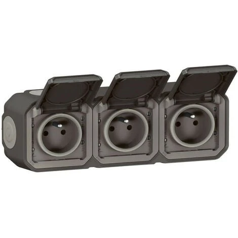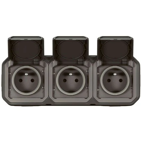 Triple prise de courant avec terre étanche avec volet Plexo 16A 250V pour montage en horizontal, complète livrée avec boîtier saillie 3 postes pour montage en apparent – anthracite