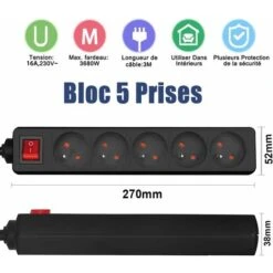Multiprise Monobloc 5 Prises 16A Avec Rallonge Interrupteur 3M 230 V Avec Sécurité Enfant, Noir