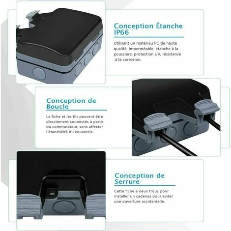 S?r et pratique à utiliser: cette fiche a deux trous pour installer un cadenas pour éviter une ouverture accidentelle. Il peut être ouvert à tout moment lorsqu’il a besoin d’électricité.