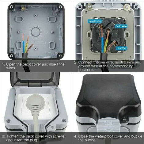 pas. [Prise murale s?re à utiliser] Cette prise murale externe étanche a des trous de prise et un couvercle verrouillable pour éviter toute ouverture accidentelle. La tension nominale est de 220V-250V. [Prise murale de mise à niveau] Les prises et les cables peuvent être connectés directement via le commutateur sans affecter létanchéité du couvercle. Le grand espace de cablage offre suffisamment despace pour tous les cables nécessaires et évite beaucoup